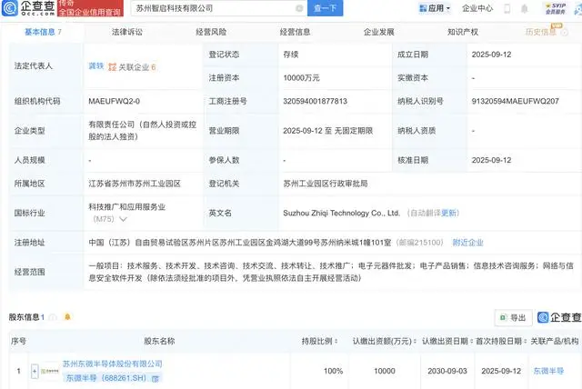 企查查APP显示,近日,苏州智启科技有限公司成立,注册资本1亿元,经营范围包含:电子元器件批发;电子产品销售;信息技术咨询服务;网络与信息安全软件开发等。企查查股权穿透显示,该公司由东微半导(688261)全资持股